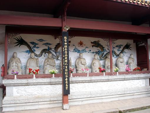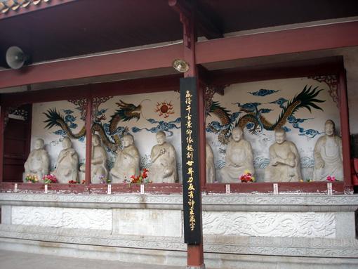 观音阁前左右配庑奉光绪十九年(1893年)雕汉白玉罗汉18尊,每尊1.5米,形态各异
