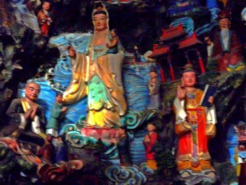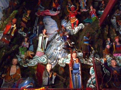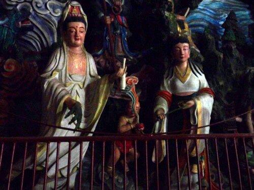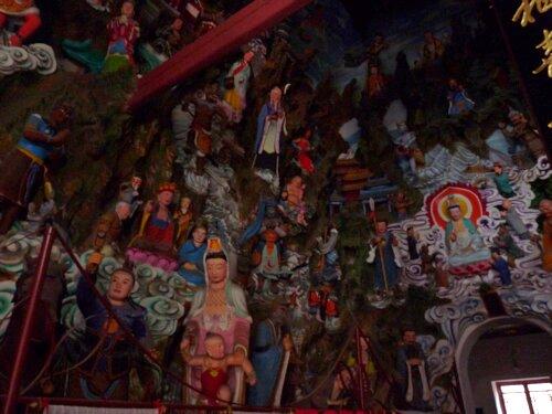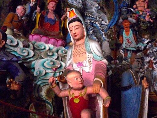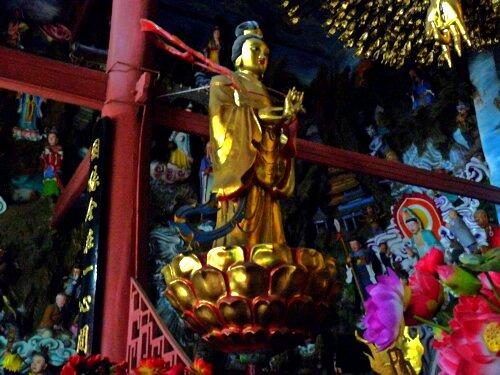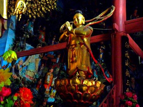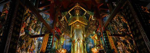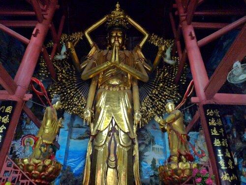 泥塑和木雕混合结构,全身金装,高11.8米,为江南最高大的观音佛像,佛像直立于莲花宝座上,面颊丰满,双目微俯,形态端庄慈祥。佛顶宝冠二十四面,各面塑有化佛;上身千手,其中四双大手或高捧佛祖,或合掌天书,或挥臂执戟,或屈指掐算;下身衣带自然飘垂,具有轻纱透明的质感。