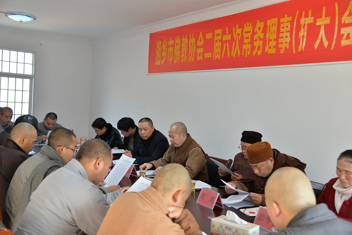 20171220日上午 湘乡市佛教协会二届六次常务理事(扩大)会议在云门寺丈室四楼会议室召开。会议学习了十九大文件精神,学习了新修的《宗教事务条例》,学习了12部门近日联合下发《关于进一步治理佛教道教商业化问题的若干意见》听取了法通会长作的《2017年度工作总结与2018年工作计划》;各位理事讨论了《报告》,大家原则同意2017年工作总结和2018年的工作计划安排;会议最后由市民宗局戴奇、民宗局组长龙德和市委统战部左督建副部长分别代表市民宗局及市委统战部作了讲话。