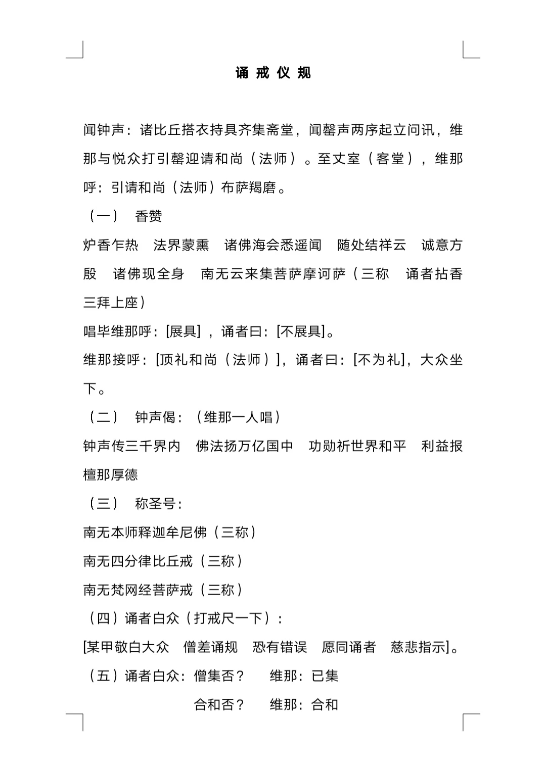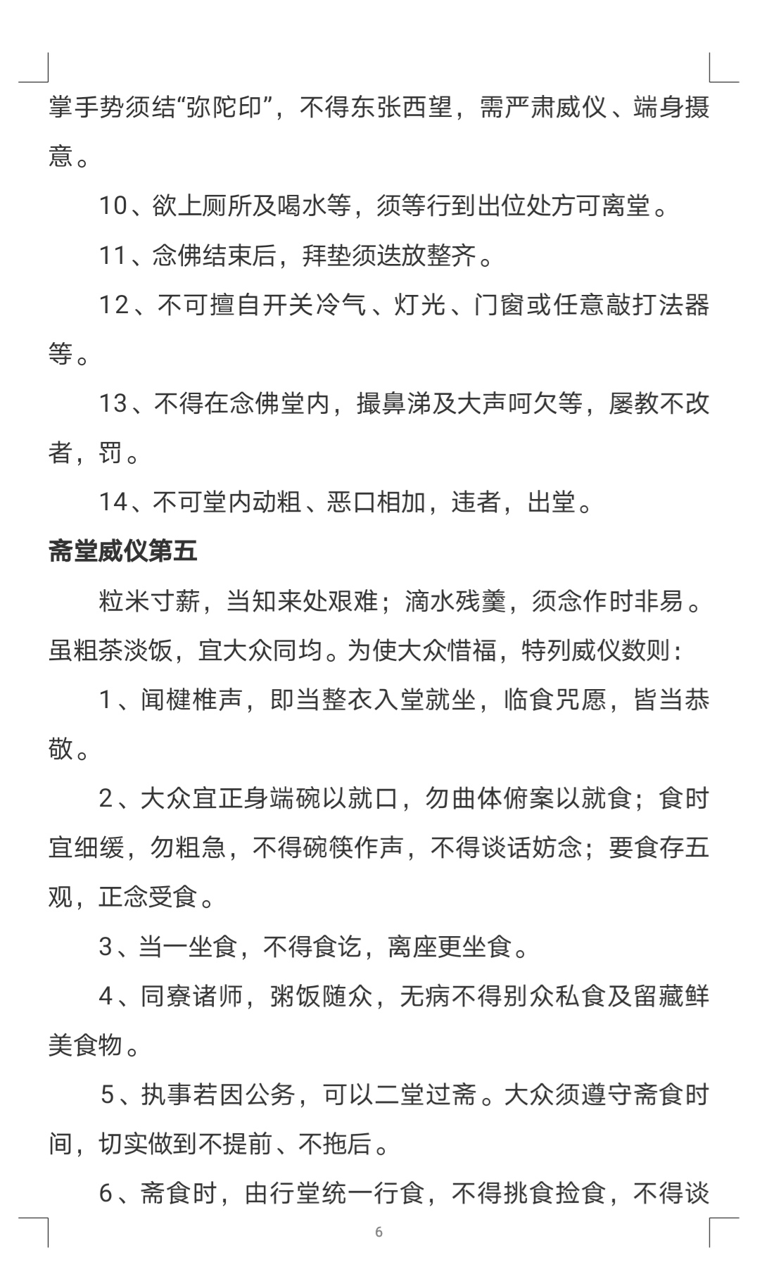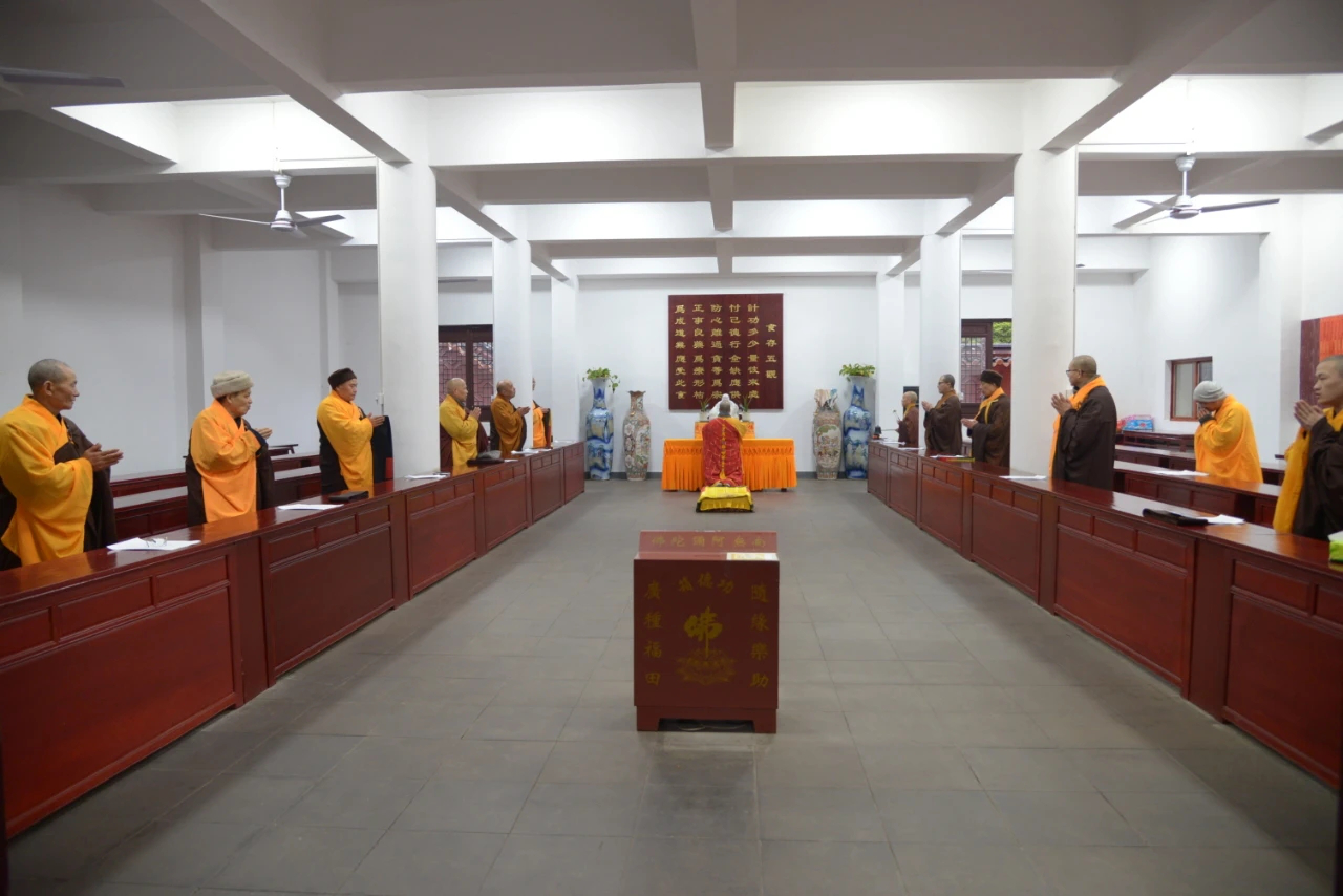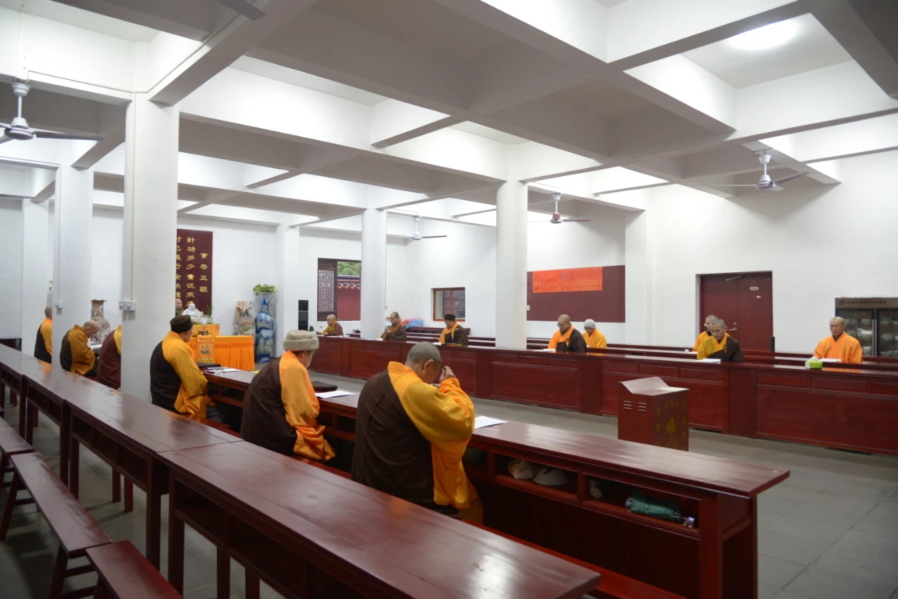 每月农历初一、十五日布萨诵规之时,全寺所有僧众,包括比丘、沙弥,皆须穿袍搭衣齐聚斋堂,依法如律参加诵规。