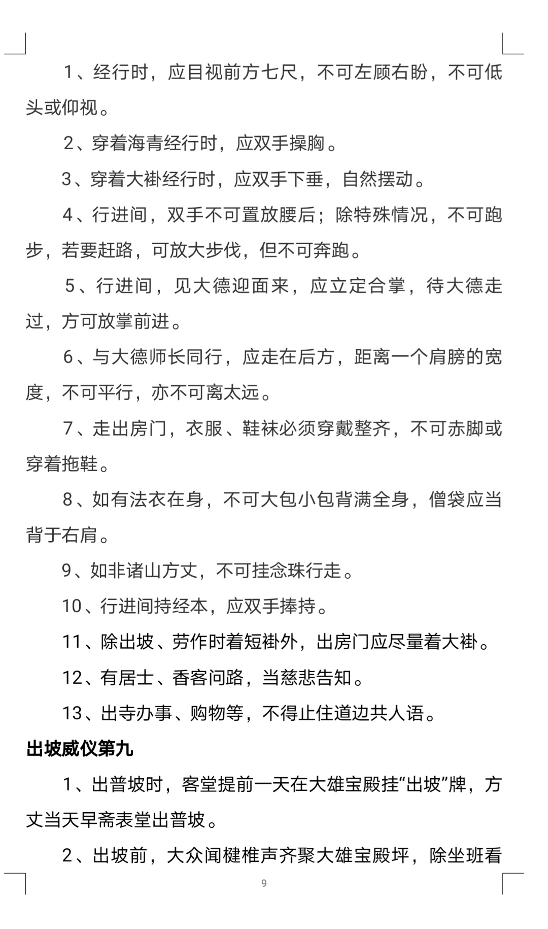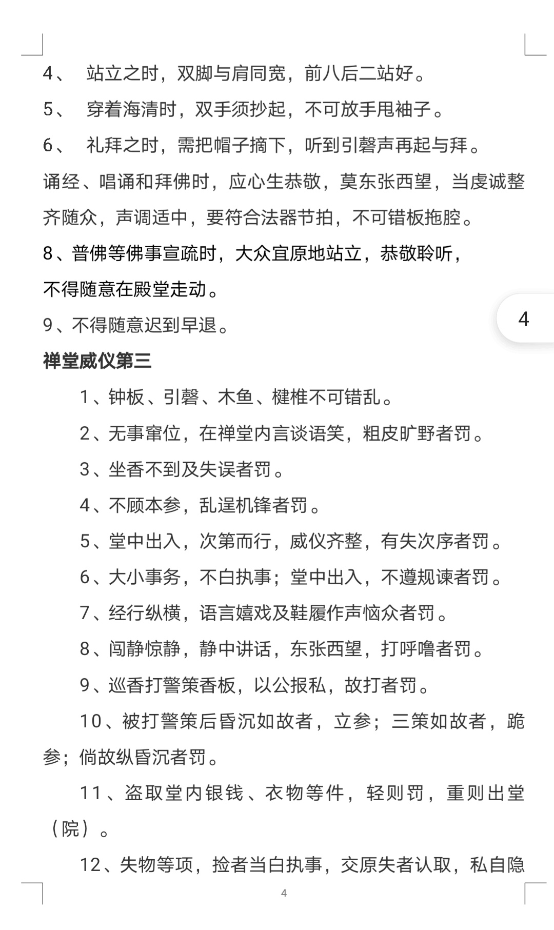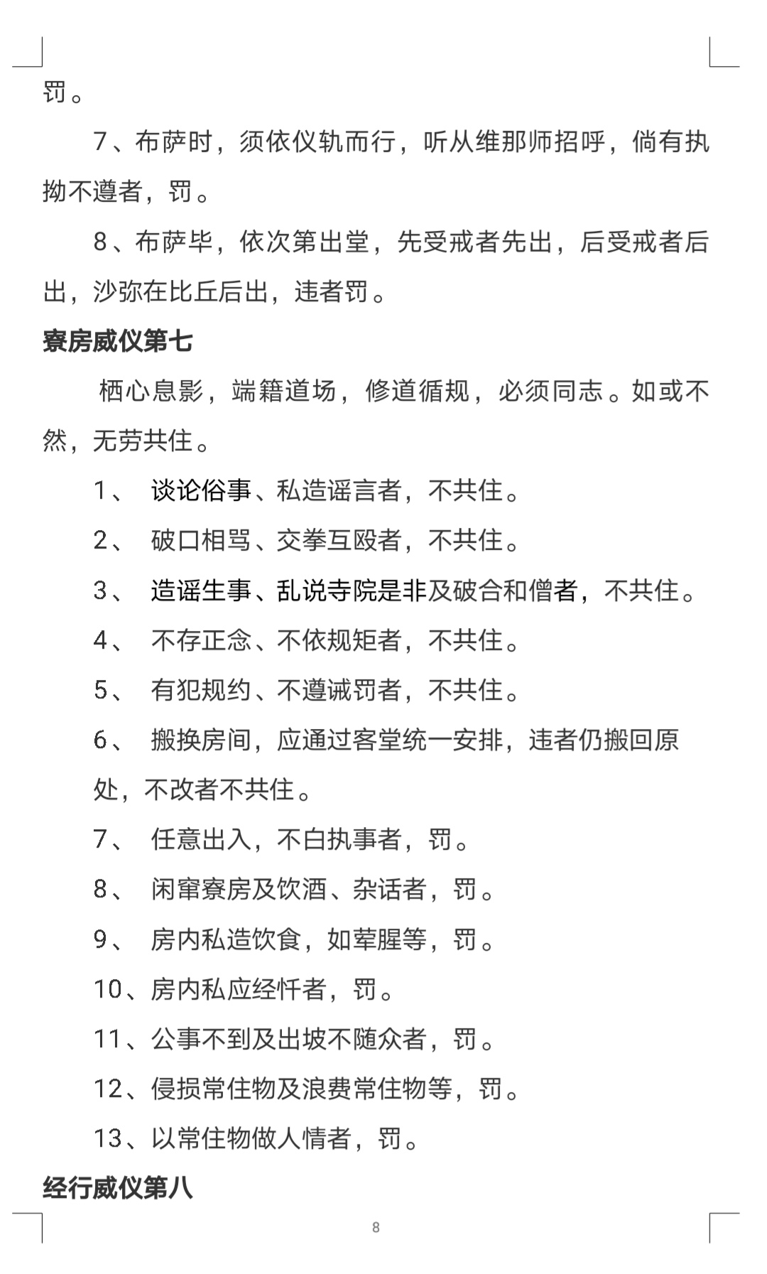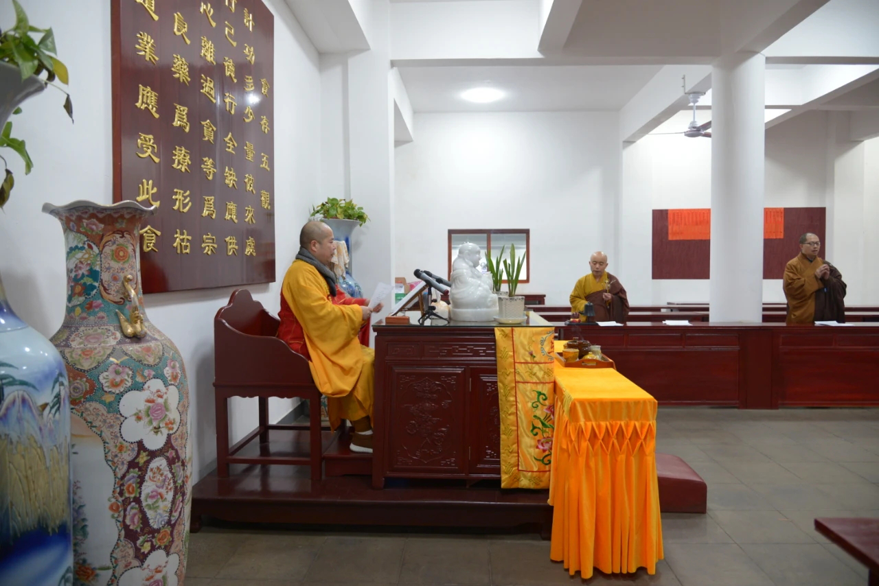 每月农历初一、十五日布萨诵规之时,全寺所有僧众,包括比丘、沙弥,皆须穿袍搭衣齐聚斋堂,依法如律参加诵规。