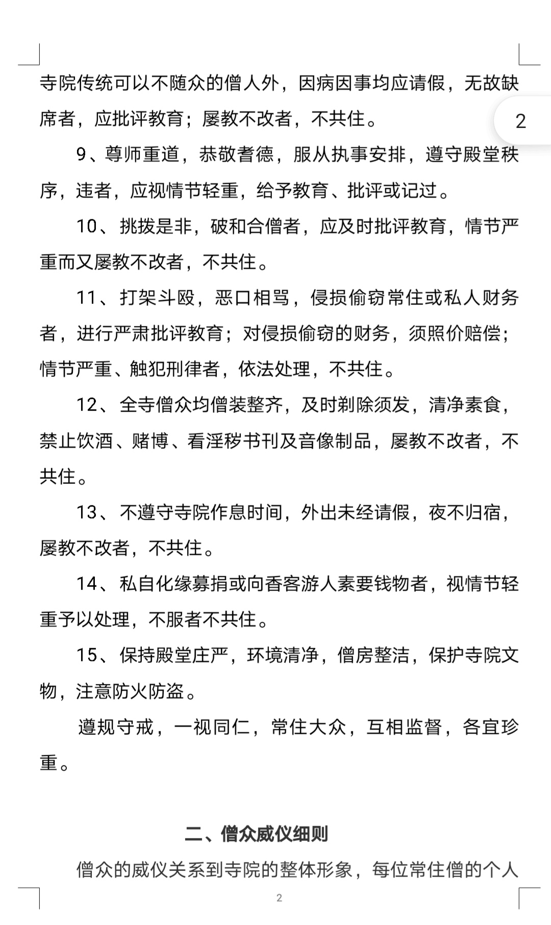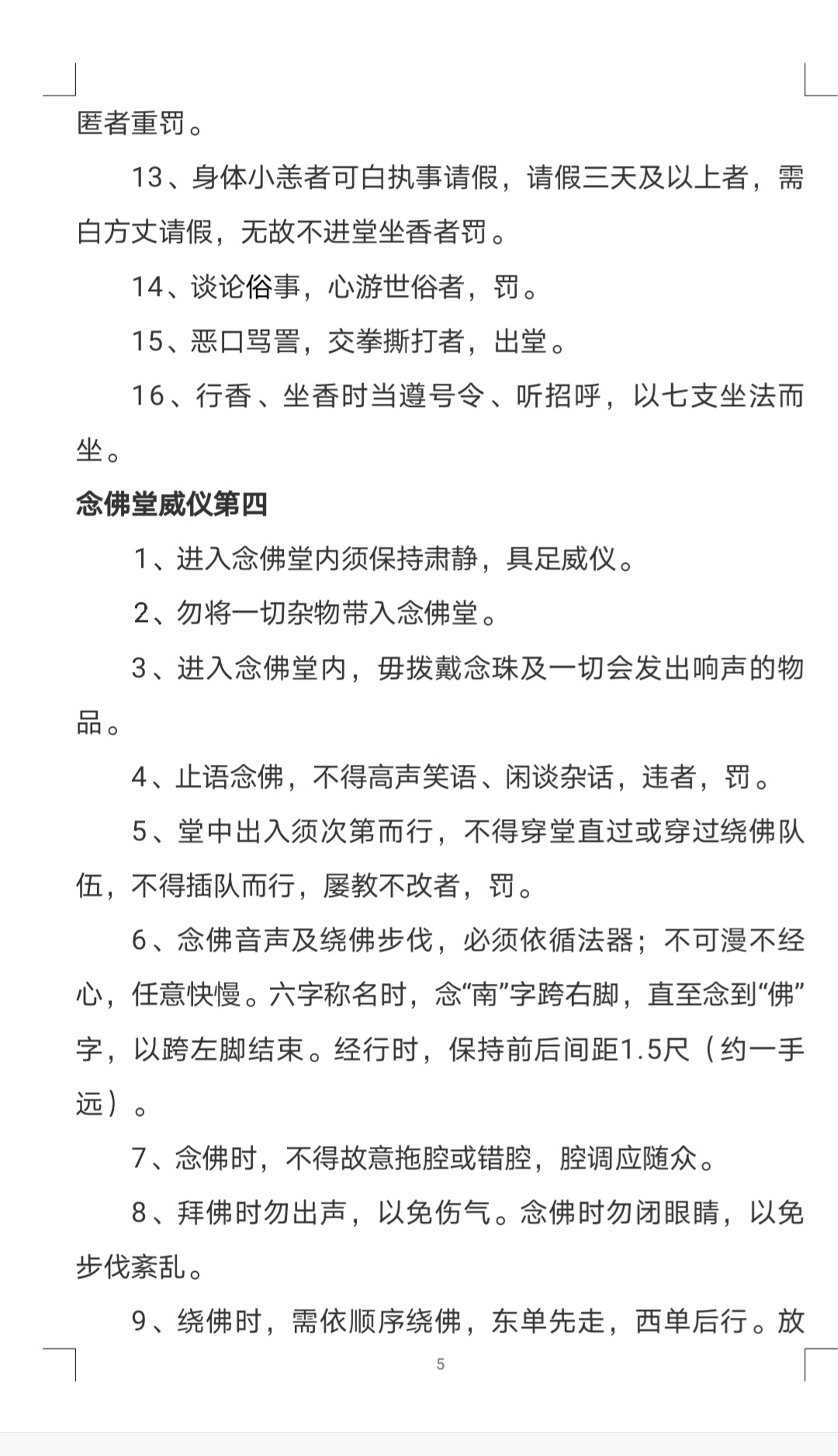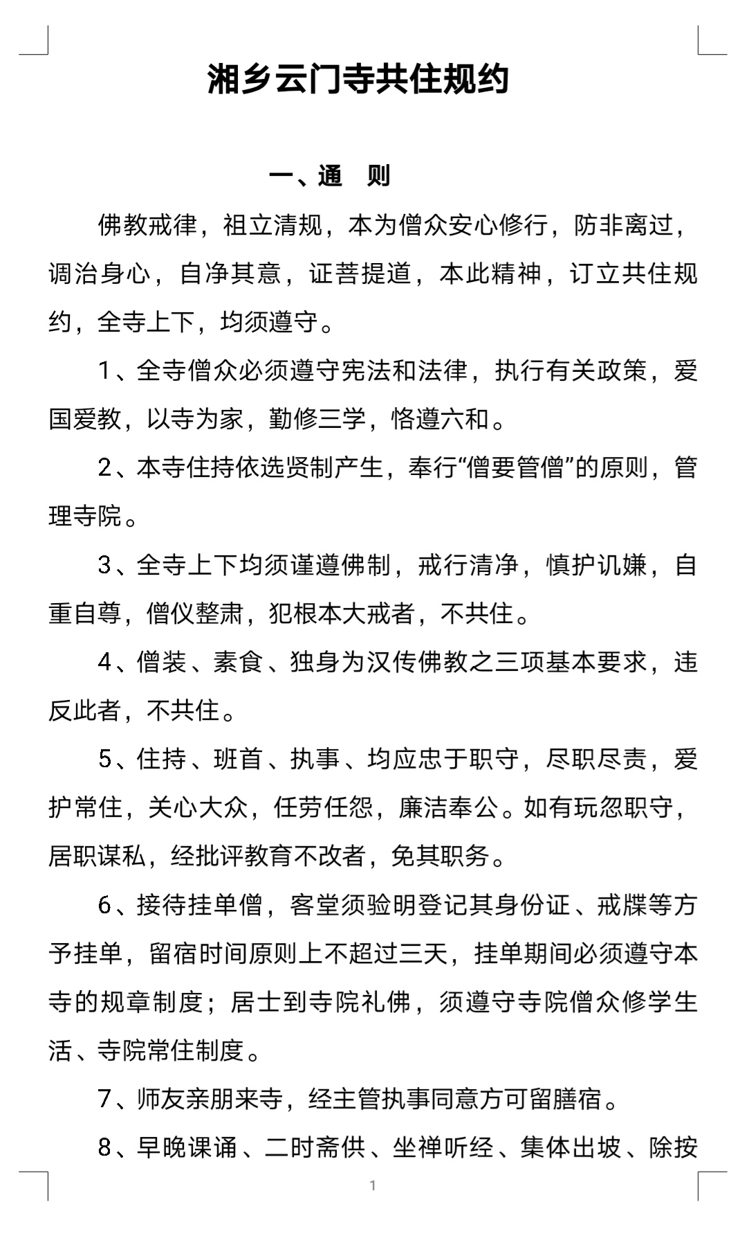 布萨诵规 为坚持佛教中国化的方向,加强道风建设,积极引导佛教与社会主义社会相适应,湘乡云门寺奉行佛陀遗训与祖师家风,特根据《四分律比丘戒本》《梵网经菩萨戒本》的精神特制定了“一通则一细则”共住规约。