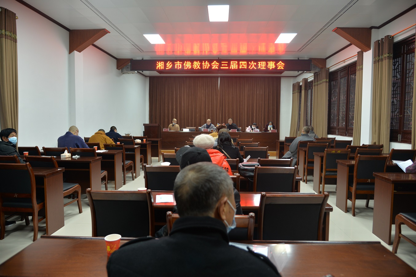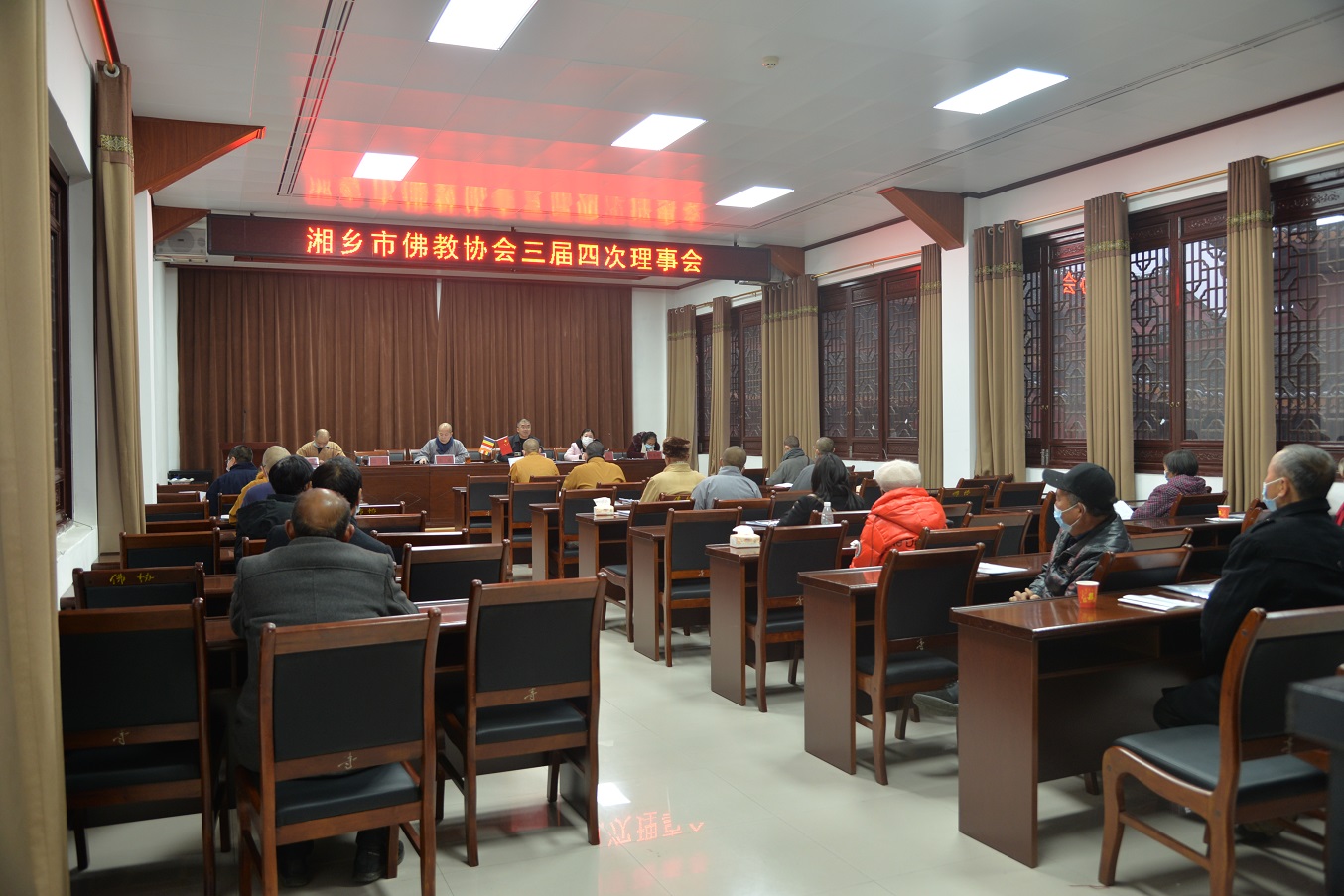 2021年12月24日下午15:00,湘乡市佛教协会三届四次会议在湘乡市云门寺佛协二楼“虚云礼堂”召开,湘乡市委统战部常务副部长、市民宗局长陈赛国先生,市民宗局李妍霏主任出席了会议。会议由会长法通大和尚主持,湘乡市佛教协会常务副会长印宗法师、副会长彭冬吾居士、秘书长送莲法师以及来自湘乡市20余座寺院的法师与寺院负责人参加会议。