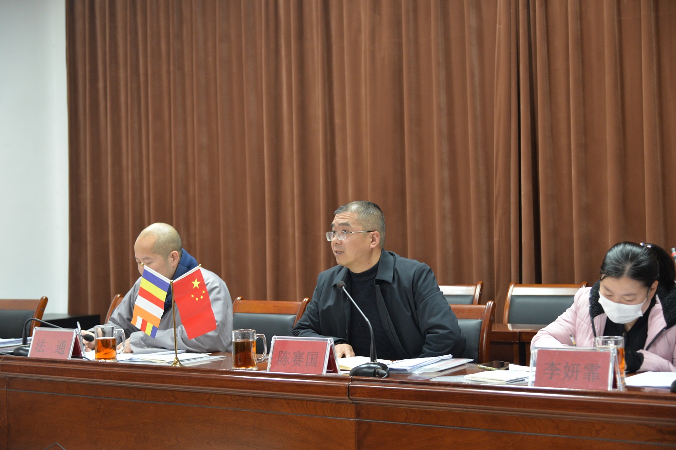 会议最后,由陈赛国部长讲话。陈部长一方面对湘乡市佛教协会2021年所做的有关防疫、慈善、消防、建设等方方面面的工作予以充分肯定;另一方面他指出佛教界人士应当以玄奘大师、虚云老和尚等祖师为榜样,努力加强道风建设,团结好信教群众,坚持佛教中国化发展方向,积极引导佛教与社会主义社会相适应,为实现中华民族伟大复兴的中国梦作出积极的贡献。
