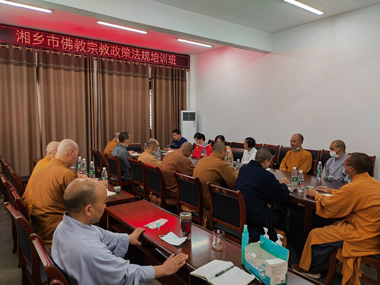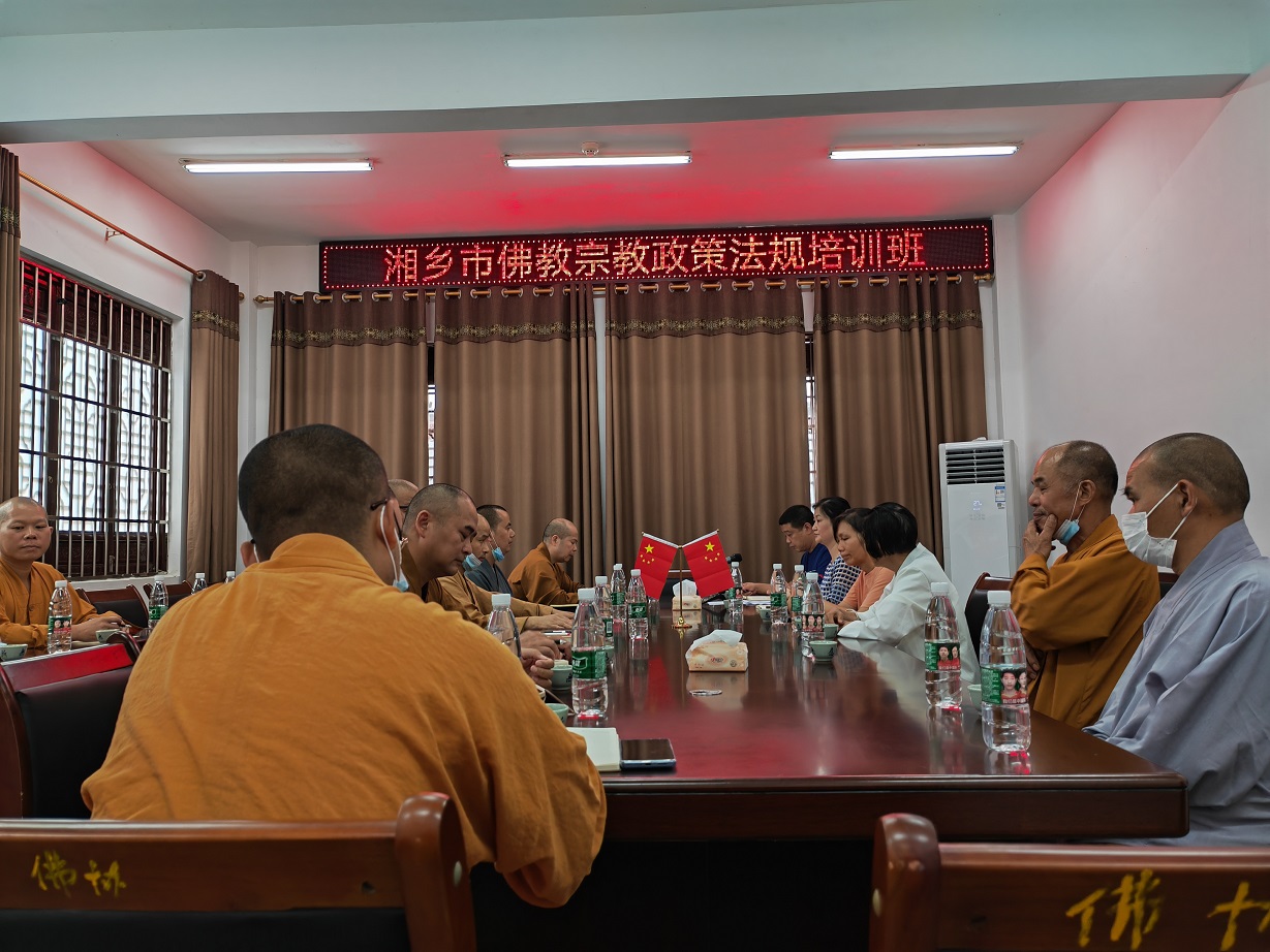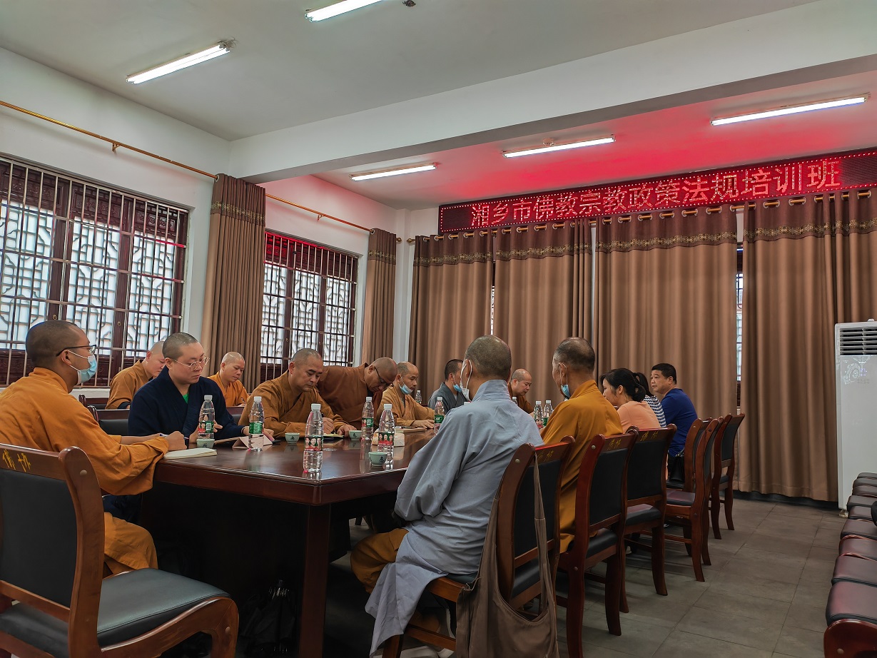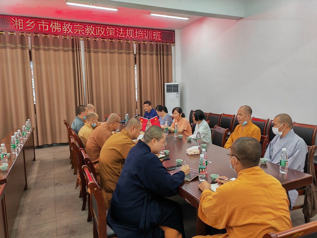 2022年7月7日下午15:00,在湘乡市民宗局的领导下,湘乡市佛教界举行了宗教政策法规培训学习。湘乡市民宗局办公室戴奇主任、民宗局二级主任科员罗利华主任、民宗局陈志清主任出席会议,会议由罗利华主任主持,湘乡市佛教协会会长法通大和尚、常务副会长印宗法师、副会长彭冬吾居士、秘书长送莲法师以及来自湘乡市10余座重点寺院的法师参加了会议。 此次会议是湘乡市佛教界上半年以来的一次重要学习会议,会上,戴奇主任代表民宗局主要在三个方面做了讲话: 1、增强政治意识,深入学习习近平总书记关于宗教工作的重要讲话精神等,坚持我国宗教中国化方向,引导佛教界与社会主义社会相适应; 2、加强管理,包括对宗教团体、宗教教职人员与信教群众的管理; 3、加强学习,带领宗教教职人员与信教群众加强宗教政策法规的学习、加强本宗教的教理教规与传统文化的学习等。 随后,主持人罗利华主任发表讲话,分别在提高政治站位、提高履职尽责、健全工作机制、发挥宗教界自身积极作用等方面做了补充。 最后,法通大和尚代表佛教界发言,非常赞同两位主任的讲话,表示佛教界应该以此次学习为契机,坚持做好自省自思自我完善的工作,努力加强自身建设,发挥佛教界在正信正行、公益慈善等方面的优势,主动履行社会责任,给社会传递更多的正能量,为党的二十大召开做出佛教界的应有贡献。